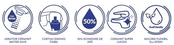 Acoperirea Cersanit Super Shine garantează, de asemenea, o durabilitate ridicată a suprafeței chiar și după mulți ani de utilizare. Bateria cu cap ceramic cu diametrul de 35 mm este echipata cu un aerator mobil Cersanit Water Save care permite controlul precis al fluxului de apa. Reduce consumul de apa si limiteaza debitul de apa la 6 l/min.