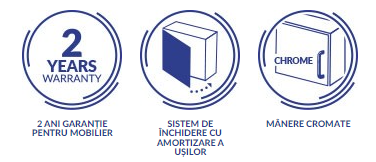 Oferim o garanție de 2 ani pentru defectele de fabricație ale mobilierului nostru, precum și pentru funcționarea corectă a ghidajelor și balamalelor.